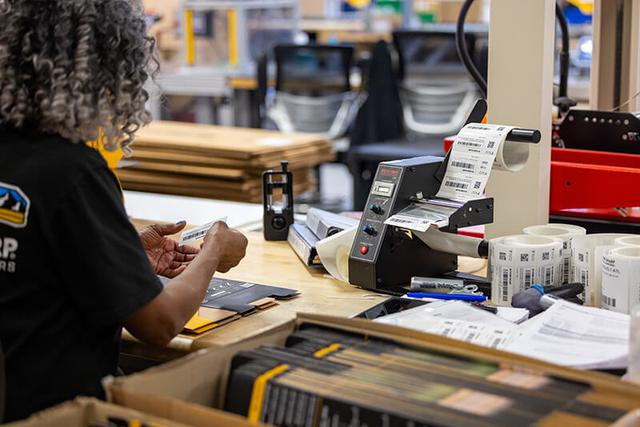 Work Sharp employee placing labels with Amazon Transparency Codes onto product boxes